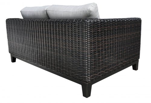 The Aubrey wicker patio furniture is handwoven in weather-resistant SolWeave® round-style wicker on a powder-coated aluminum frame. The SolWeave® wicker is easy to maintain. The Aubrey wicker patio furniture design is suitable for residential, commercial and patio wine bars. The Aubrey wicker patio furniture group photo is shown in Canadian-made outdoor cushions with Sunbrella® 40012-0096 Fife Smoke cushions and Sunbrella® 145339-0006 Gable Stone pillows.