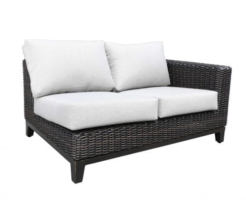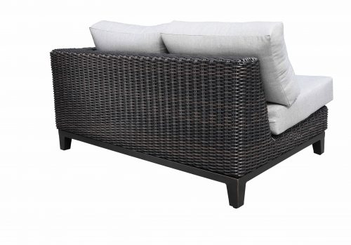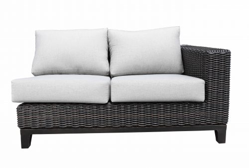 The Aubrey wicker patio furniture is handwoven in weather-resistant SolWeave® round-style wicker on a powder-coated aluminum frame. The SolWeave® wicker is easy to maintain. The Aubrey wicker patio furniture design is suitable for residential, commercial and patio wine bars. The Aubrey wicker patio furniture group photo is shown in Canadian-made outdoor cushions with Sunbrella® 40012-0096 Fife Smoke cushions and Sunbrella® 145339-0006 Gable Stone pillows.