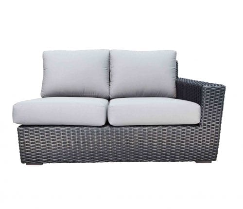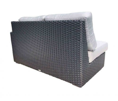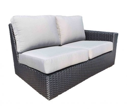 The Brighton patio furniture collection uses SolWeave® outdoor wicker that is hand woven onto an aluminum frame. The wide style, solid black wicker is clean and modern and gives a high end luxury look, sure to be a beautiful addition to your outdoor setting. The collection includes a variety of pieces to form multiple combinations of patio conversation sets, dining sets, and outdoor sectionals. Cushions are custom made in Toronto using your choice of Sunbrella® fabrics. Outdoor cushions are a great way to provide extra style and additional comfort. Cushions shown are 54048 Charcoal. The group picture cushions shown are 54048 Charcoal, 18″ pillows are 5404 Natural, and 5477 Red.