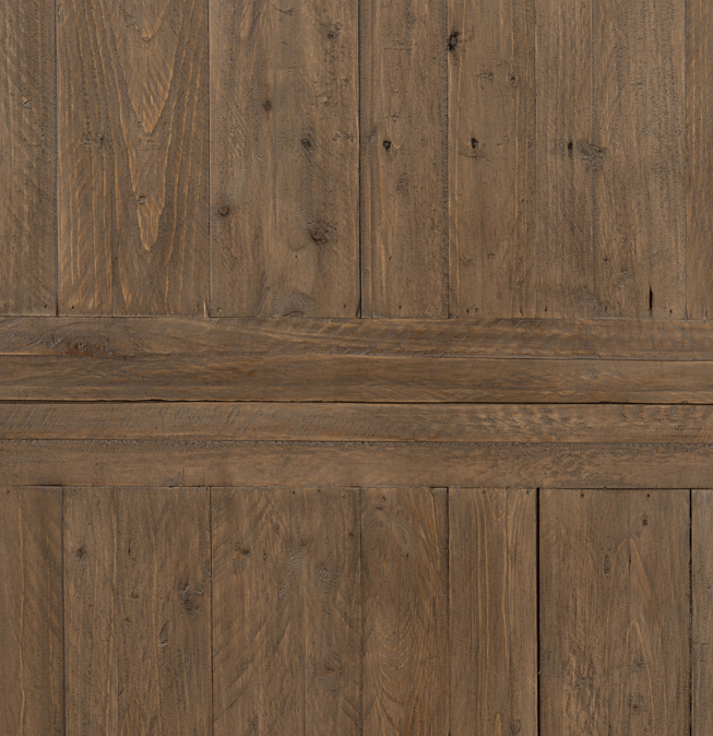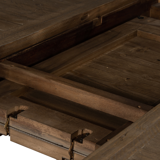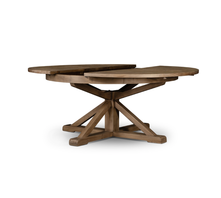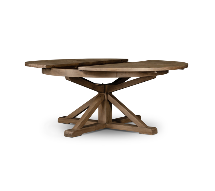 A welcoming, round farmhouse table draws the eye with its reclaimed wood top and a compelling architectural base in a rustic black olive finish. Easily extends to 79" with built-in leaf.