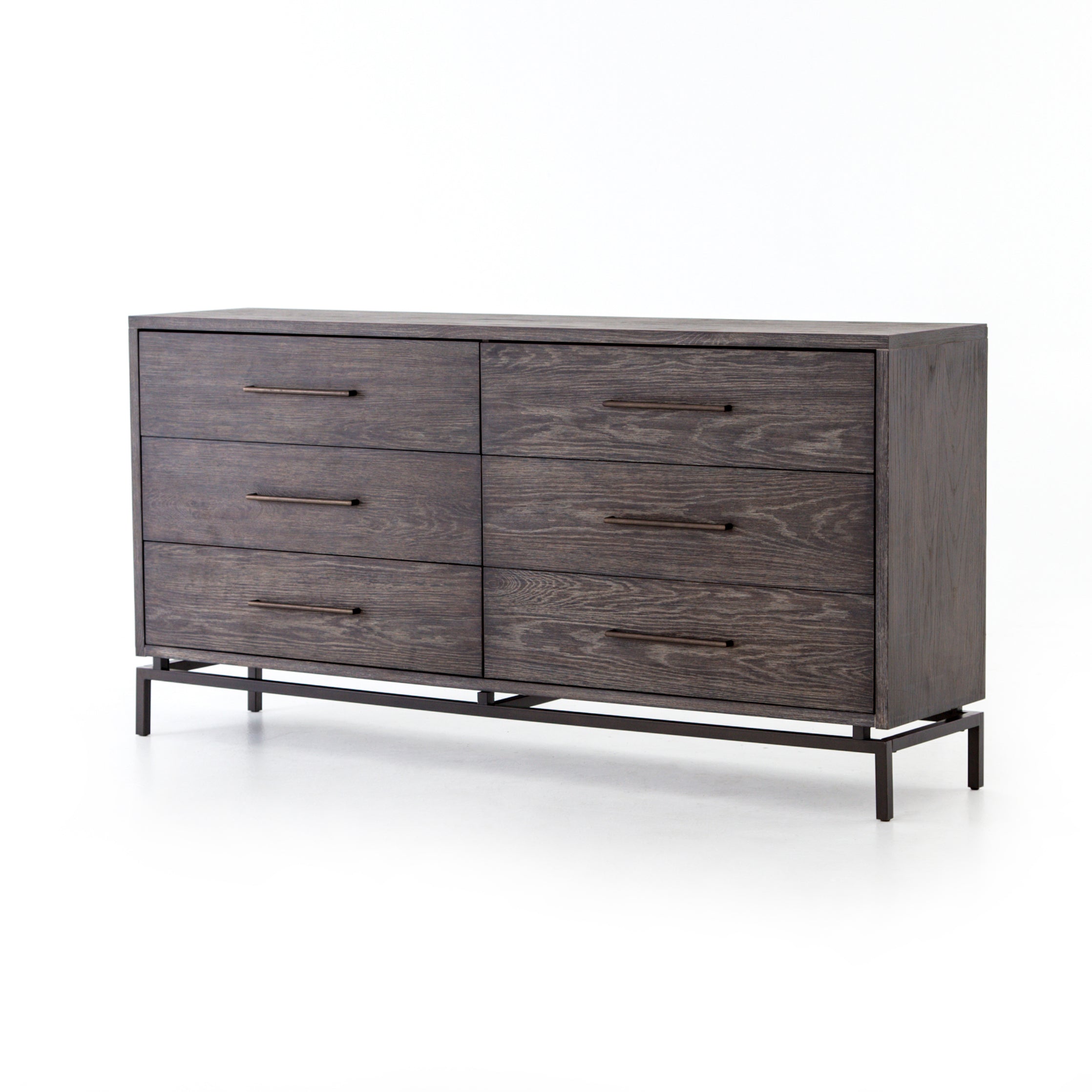 A floating iron base lightens the natural depth of grey-finished oak, as clean lines lend a tailored look to warm rustic tones. Six spacious drawers bring plenty of storage options to the modernized bedroom.