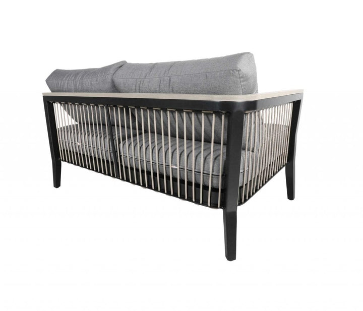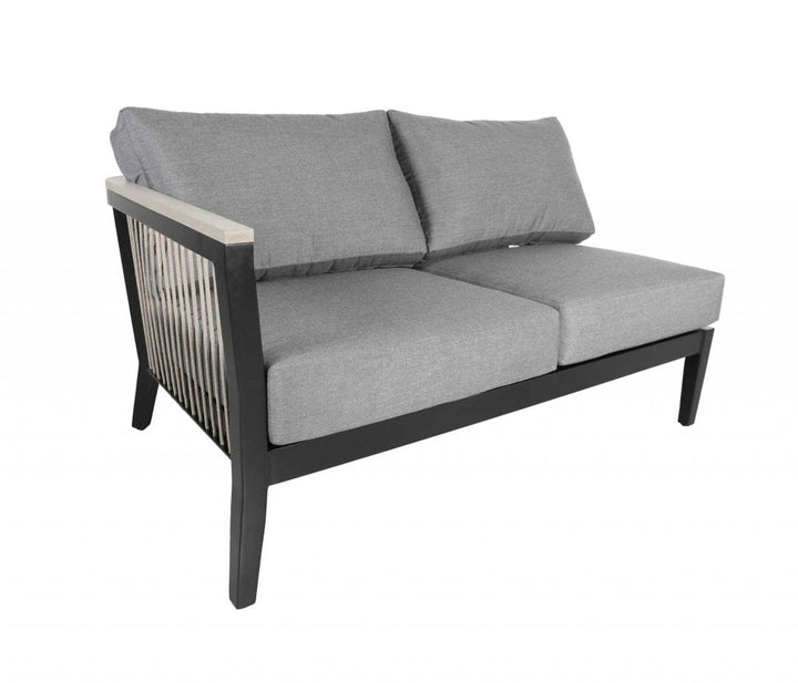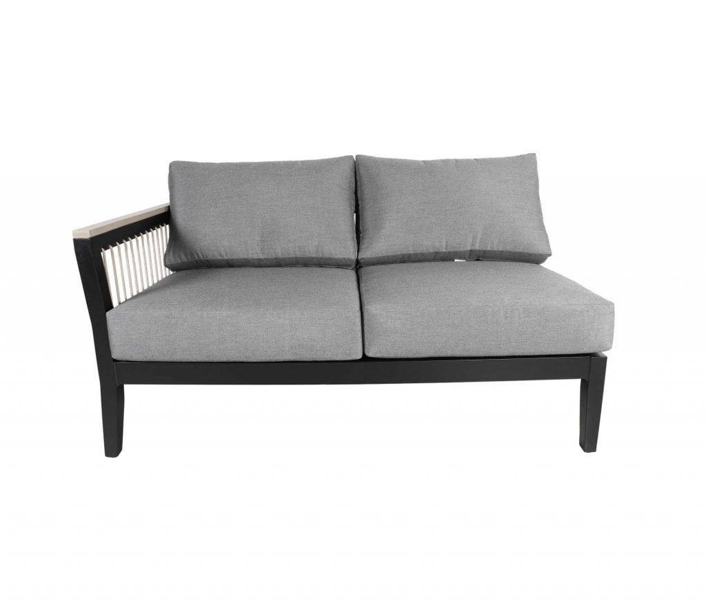 The Cove rope patio furniture collection is crafted in SOL Rope™ paired with Sunbrella® or Tempotest® outdoor cushions. Coordinating deep seating, sectional, lounge and a variety of dining height options will transform any outdoor venue into a comfortable, restful oasis. The Cove patio furniture group photo is shown in Canadian-made outdoor cushions in Sunbrella® 40434 Cast Slate and pillows shown in Sunbrella® 145339-006 Gable Stone on Taupe SOL Rope™ with a Weathered SOL Teak™ arm.