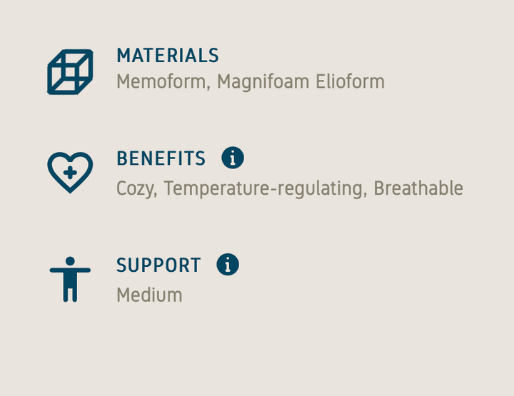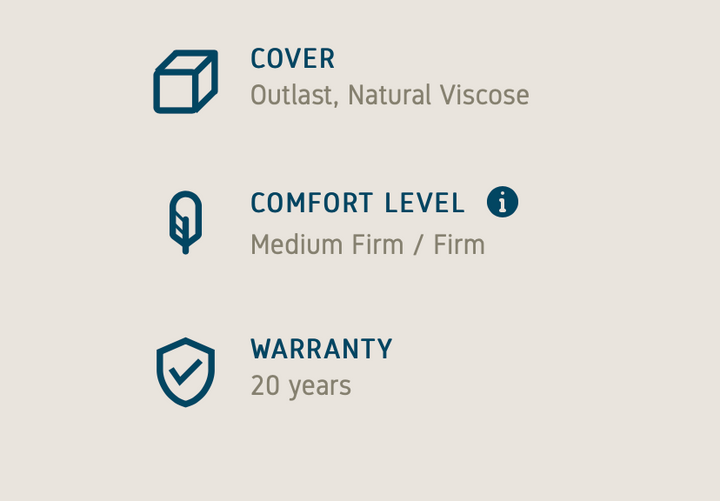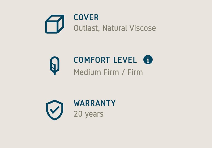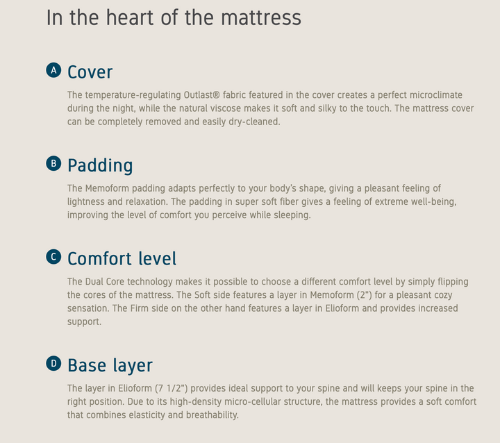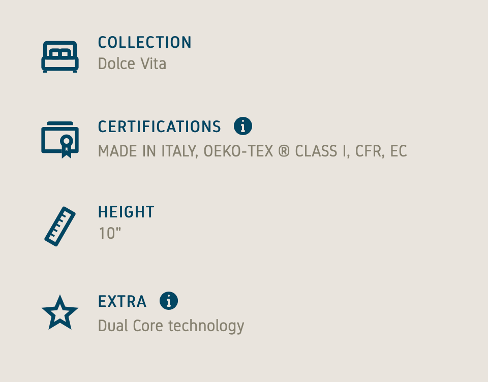 Comfort Dual 10 of the Dolce Vita line is inspired by the excellence of Made in Italy and of the Italian lifestyle. The combination of materials like Memoform and Elioform, along with the refined cover in natural Viscose and the innovative Outlast® fabric, provide a soft support in 10" of height. The Dual Core technology ensures the perfect comfort for couples with different comfort preferences.