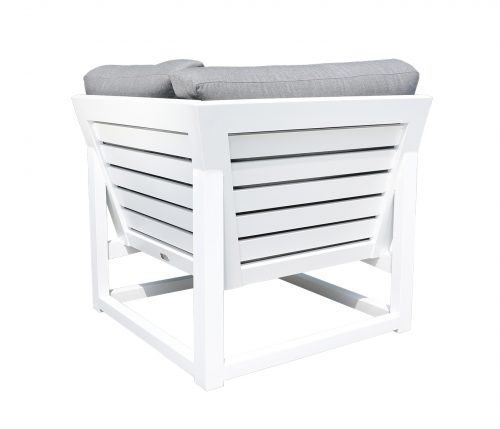 The Gramercy patio furniture collection is beautifully deisgned in TigerDrylac® White cast aluminum. The cast aluminum frames are easy to maintain. The luxurious design is suitable for residential and commercial settings. The Gramercy outdoor sectional patio furniture group photo is shown in Sunbrella® 40434 Cast Slate cushions, pillows in 21″*13″ Tempotest® 51353-8 Mason Cherry and 18″ 986-98 Home Cherry.