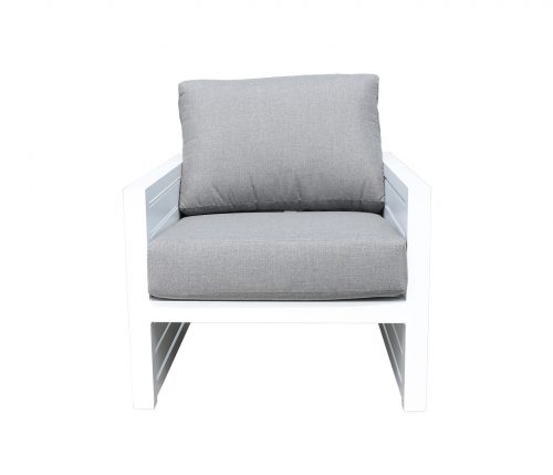 The Gramercy patio furniture collection features TigerDrylac® White cast aluminum. The cast aluminum frames are easy to maintain. The luxurious design is suitable for residential and commercial settings. The Gramercy patio furniture group photo is shown in Sunbrella® 40434 Cast Slate cushions, pillows in 21″*13″ Tempotest® 51353-8 Mason Cherry and 18″ 986-98 Home Cherry.