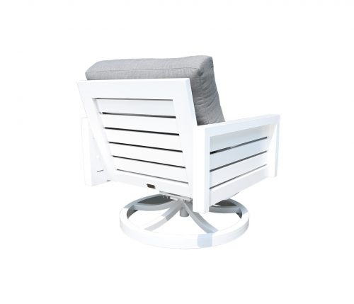 The Gramercy patio furniture collection features TigerDrylac® White cast aluminum. The cast aluminum frames are easy to maintain. The luxurious design is suitable for residential and commercial settings. The Gramercy patio furniture group photo is shown in Sunbrella® 40434 Cast Slate cushions, pillows in 21″*13″ Tempotest® 51353-8 Mason Cherry and 18″ 986-98 Home Cherry. For Residential use.