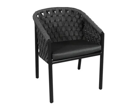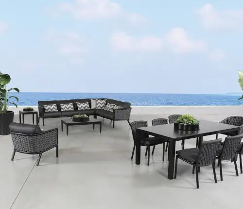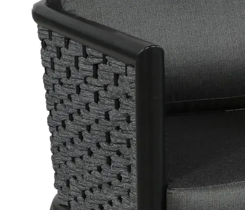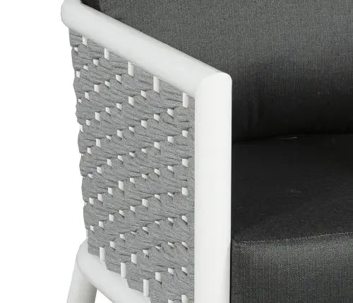 Harlow’s sheltering, rounded chair back, and neo retro angled back legs set the tone for effortless style and serenity. Accented with – NEW for 2023 – Tungsten SOL Rope™ on Sherwin-Williams® Black frame, or – NEW for 2023 – Chroma SOL Rope™ with Tiger Drylac® White frame, Harlow is available in dining, deep seating, and sectional options. The Harlow collection delivers the essence of a warm embrace. Find Harlow in deep seating, sectional, and dining options. Group photo cushions shown in 1045-79 Italian Sand, 18″ x 18″ pillows shown in 1043-929 Home Sand, and 21″ x 13″ pillows shown in 145339-0006 Gable Stone.