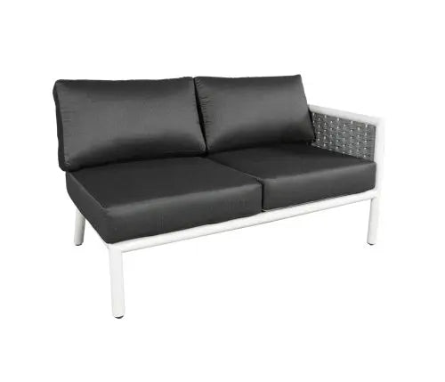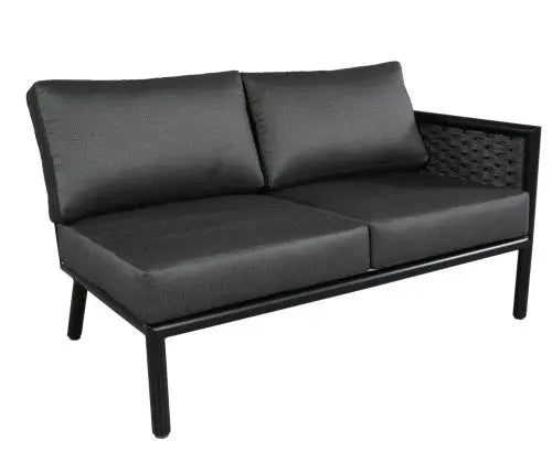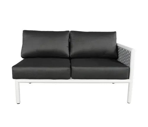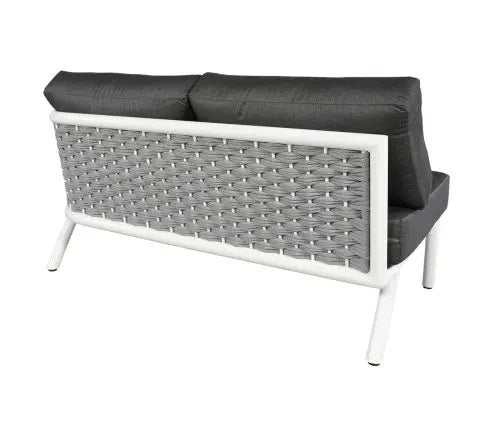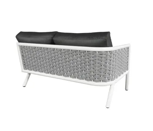 Harlow’s sheltering, rounded chair back, and neo retro angled back legs set the tone for effortless style and serenity. Accented with – NEW for 2023 – Tungsten SOL Rope™ on Sherwin-Williams® Black frame, or – NEW for 2023 – Chroma SOL Rope™ with Tiger Drylac® White frame, Harlow is available in dining, deep seating, and sectional options. The Harlow collection delivers the essence of a warm embrace. Find Harlow in deep seating, sectional, and dining options. Group photo cushions shown in 1045-79 Italian Sand, 18″ x 18″ pillows shown in 1043-929 Home Sand, and 21″ x 13″ pillows shown in 145339-0006 Gable Stone.