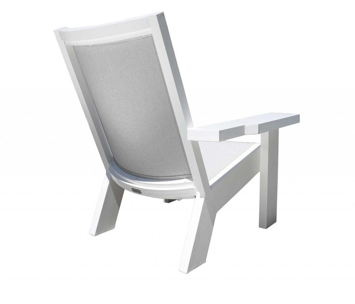 Traditional meets modern. The innovative design of the Hockley collection is made of durable cast aluminum frames and Sunbrella Sling® fabric. Available in a light or dark colourway, Hockley’s Adirondack silhouette is equally at home in a cottage, residential or country club setting. The group image is shown in Sunbrella Sling® Sailing Seagull on TigerDrylac® White cast aluminum frames. The Hockley collection is also available in Sunbrella Sling® Augustine Pewter on Sherwin-Williams® Dark Rum frames. The sling fabric is replaceable.