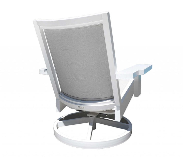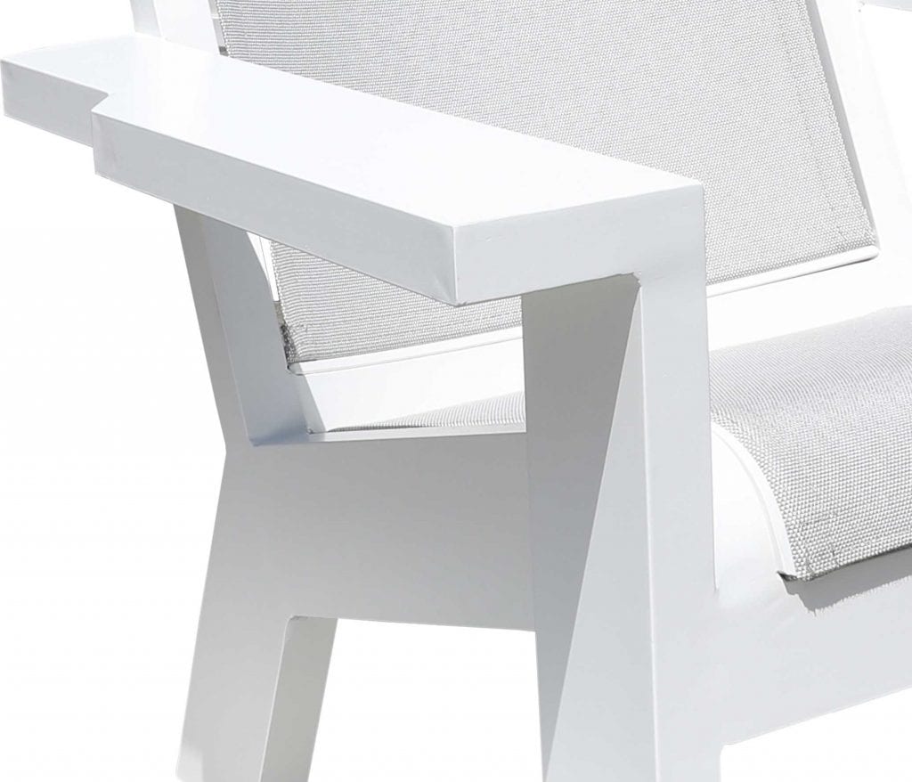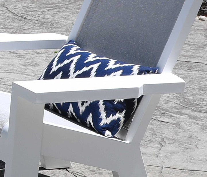 Traditional meets modern. The innovative design of the Hockley collection is made of durable cast aluminum frames and Sunbrella Sling® fabric. Available in a light or dark colourway, Hockley’s Adirondack silhouette is equally at home in a cottage, residential or country club setting. The group image is shown in Sunbrella Sling® Sailing Seagull on TigerDrylac® White cast aluminum frames. The Hockley collection is also available in Sunbrella Sling® Augustine Pewter on Sherwin-Williams® Dark Rum frames. The sling fabric is replaceable.