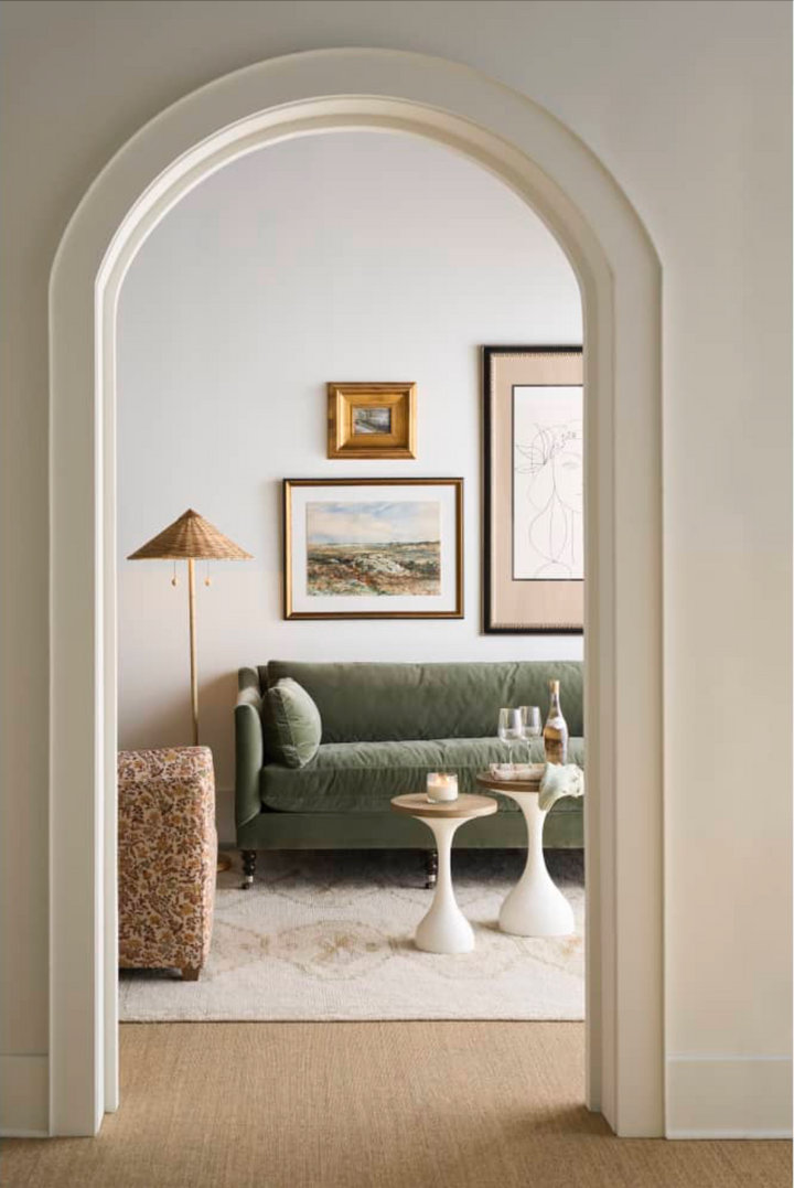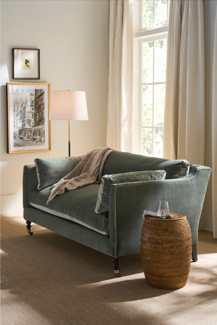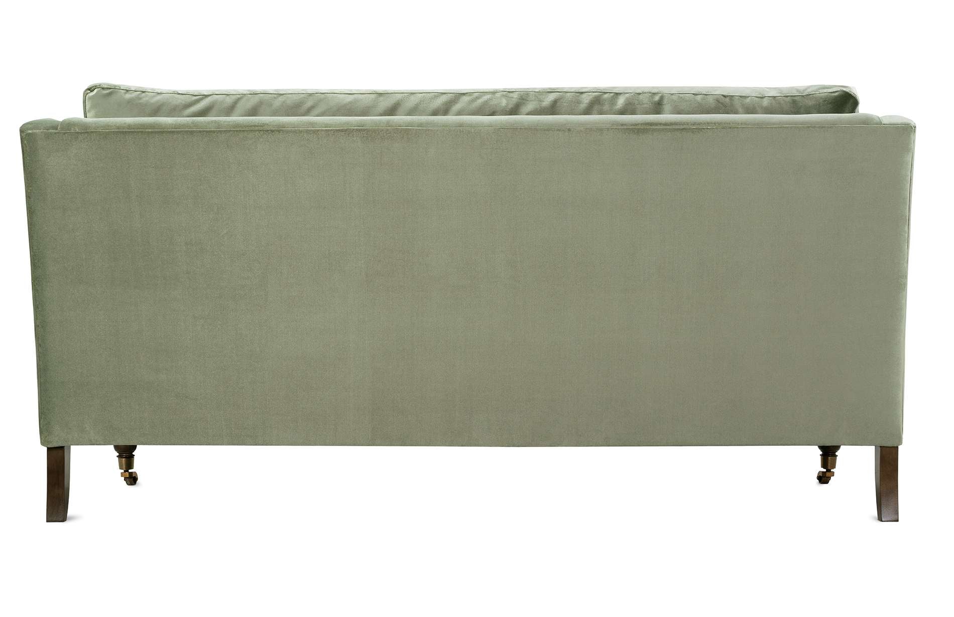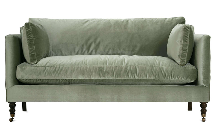 The Madeline Sofa is designed for comfort, with transitional, elegant styling. Features include lush green velvet and stylish spool legs with pewter casters.