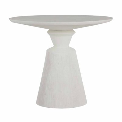 The Fisher Dining Table pairs curves and angles for an artful outdoor dining experience. Fashioned to give the appearance of cast stone, the table is a faux stone construction that enables the piece to be easily repositioned. Sturdy enough to withstand natural elements, the table features a cone-shape base textured with a vertical stria design. The 36” round tabletop offers lots of space for dining—outdoors or inside. Natural Stonecast finish.