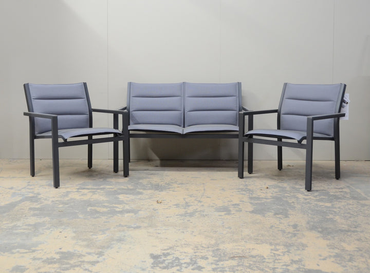 The Origin Padded Deep Seating includes a Mica SOL Teak™ arm accent, is stackable, and is offered in 2 colorways: Batyline® Spring Sling on Tiger-Drylac® White frame, and Batyline® Blue Jay Sling on Tiger-Drylac® Storm frame. Batyline® Spring Sling, Batyline® Blue Jay Sling both have a Wyzenbeek Double Rub count of > 600,000 = Heavy Duty rated.