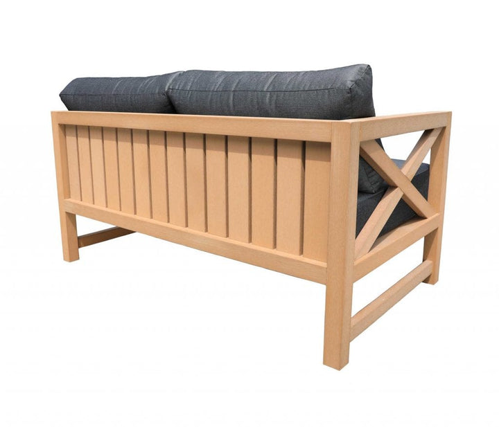 The modern design of the Kensington collection and its teak wood appearance makes this patio furniture look and feel amazingly natural. The frames are crafted in premium SolTeak™ which is as smooth and as strong as real teak, with the colour and grain throughout, and is virtually maintenance free. Classic yet modern, Kensington is available in a warm, Natural finish or Weathered grey finish, and is suitable for residential, commercial and coastal properties. The group image shows Canadian-made outdoor cushions in Tempotest® 1045-79 Italian Sand and pillows shown in Sunbrella® 145337-0001 Zebra Smoke on SolTeak™ Natural finish