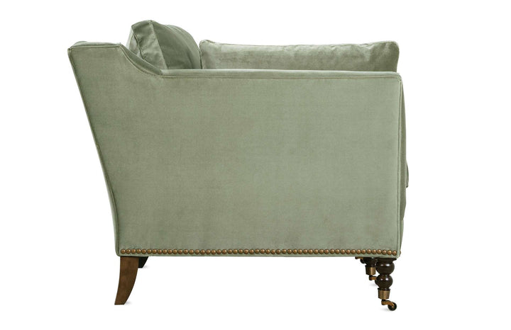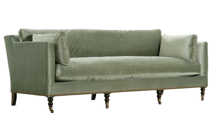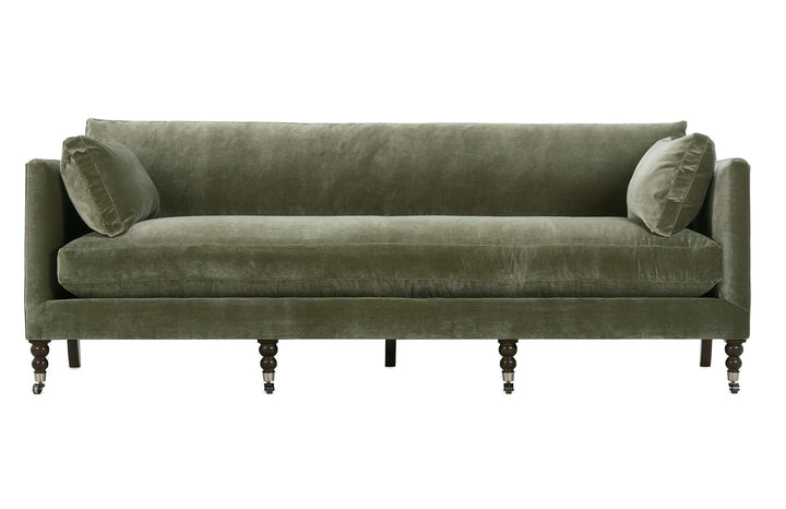 The Madeline Sofa is designed for comfort, with transitional, elegant styling. Features include lush green velvet and stylish spool legs with pewter casters