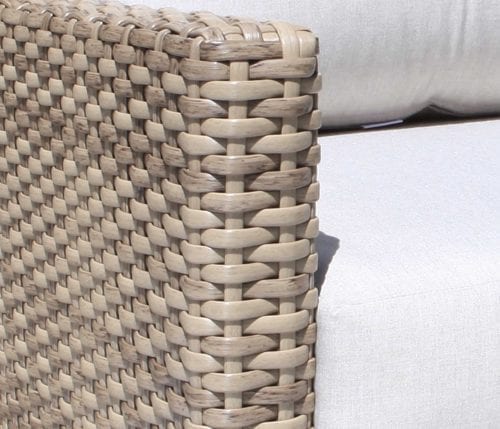 The Riverside patio furniture collection features wide style SolWeave® outdoor wicker on a powder coated aluminum frame with Sunbrella® fabric cushions. The look is modern and carefree thanks to the light colour of the Drift Teak finish. Choose from patio conversation sets, dining sets, and outdoor sectionals. Canadian made outdoor cushions shown are 40433 Cast Silver. The deep seating group picture cushions shown are 40433 Cast Silver, Pillows 40434 Cast Slate.