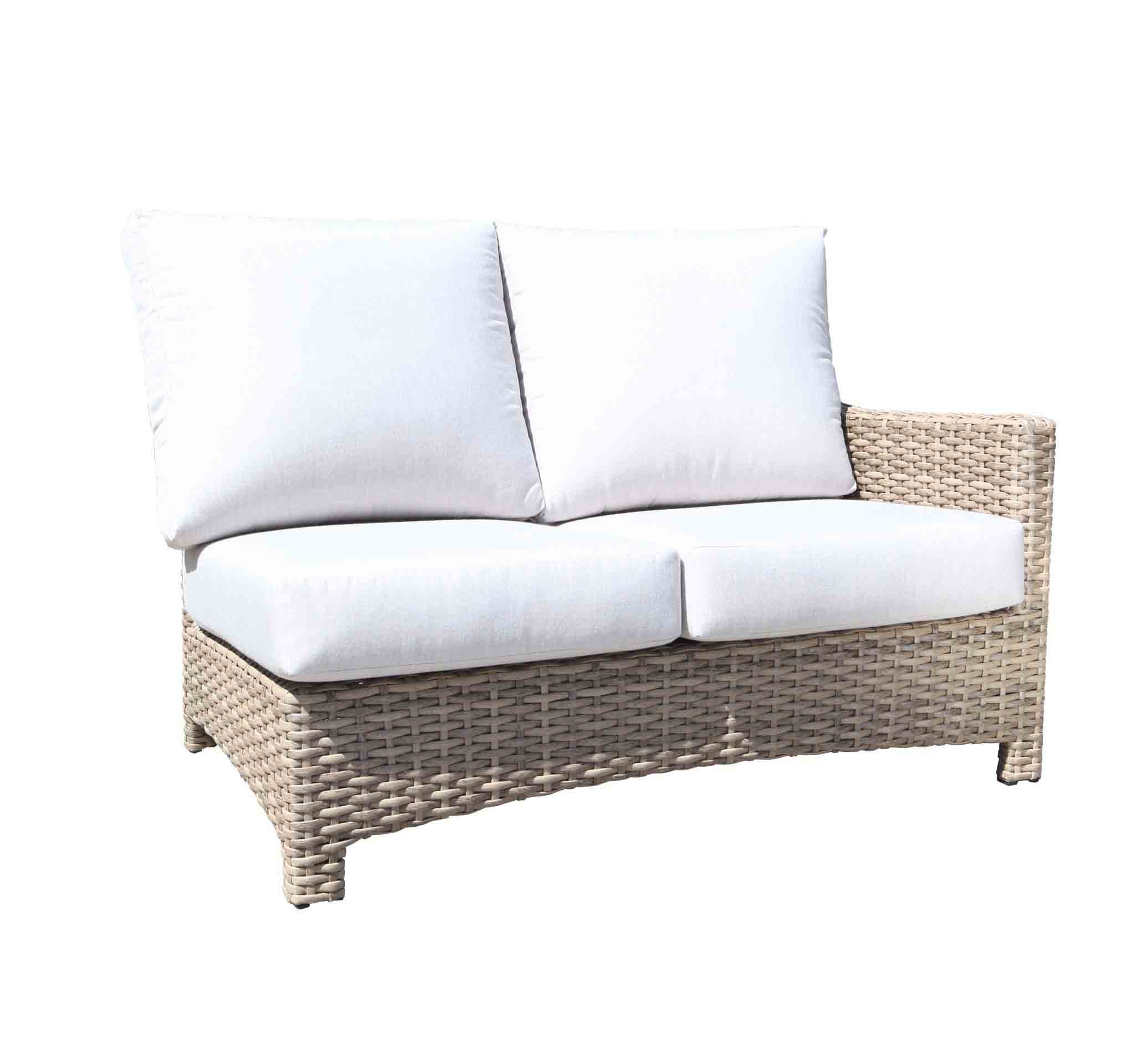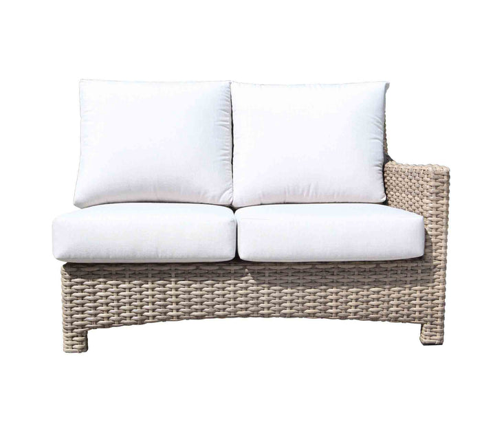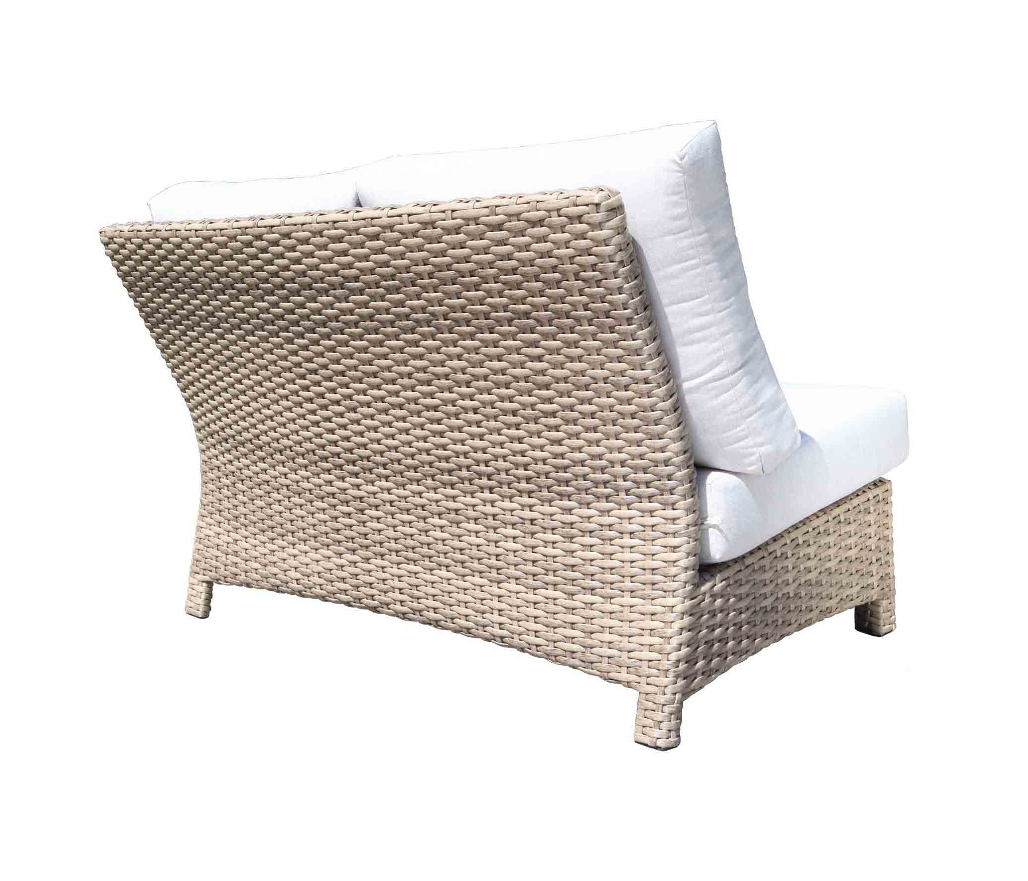 The Riverside patio furniture collection features wide style SolWeave® outdoor wicker on a powder coated aluminum frame with Sunbrella® fabric cushions. The look is modern and carefree thanks to the light colour of the Drift Teak finish. Choose from patio conversation sets, dining sets, and outdoor sectionals. Canadian made outdoor cushions shown are 40433 Cast Silver. The sectional group picture cushions shown are 40433 Cast Silver, Pillows 40434 Cast Slate.
