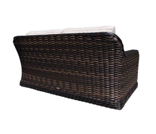 The Seafair patio furniture collection features wide and round styles of SolWeave® outdoor wicker on a powder coated aluminum frame with Sunbrella® fabric cushions. The wide arm curving up the back rest, and solid wicker straight to the floor, gives this solid piece a chunky look without feeling too heavy. The group includes patio conversation, and outdoor sectional pieces. Canadian made outdoor cushions shown are 32000-0027 Space. The deep seating group picture cushions shown are 32000-0027 Space, Pillows 32000-0027 Space.