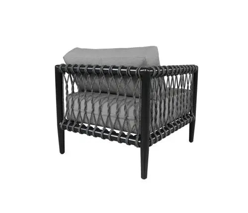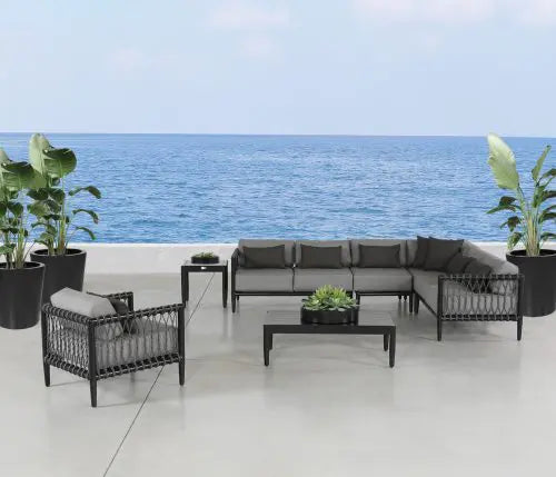 Tate is a NEW collection for 2023 and is distinguished by the interplay of breezy, thin format Mercury SOL Rope™ expertly woven on a substantial tubular aluminum frame. This design tension conveys a sense of lightness and ease, perfect for curling up with a good book or pausing to take in the view. Tate is available in both deep seating and sectional seating options. Group photo cushions shown in 48135-0003 Bliss Smoke, 21″ x 13″ pillows shown in 48135-0004 Bliss Onyx.