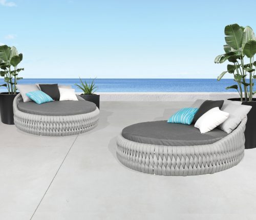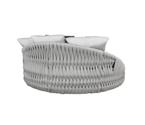 Named after the woven design elements of an outdoor garden trellis and resembling the comfort of your favorite cozy knit blanket, the new Trellis collection is not only visually captivating; it is as plush and luxurious as it looks. Trellis is highlighted with new Shadow SOL Rope™ woven onto a Sherwin-Williams® Black aluminum frame or new Zinc SOL Rope™ on a Tiger Drylac® White aluminum frame. Discover this collection in deep seating, sectional, and dining options to suit any outdoor entertainment needs. Group photo shows cushions in 40483-0001 Cast Charcoal, 21″ x 13″ pillows in 145337-0001 Zebra Smoke, and 18″ x 18″ pillows in 5402 Canvas Granite. Trellis Outdoor Daybed includes base cushion, 2 22″ x 22″ pillows, 3 20″ x 20″ pillows, and 2 18″ x 18″ pillows.
